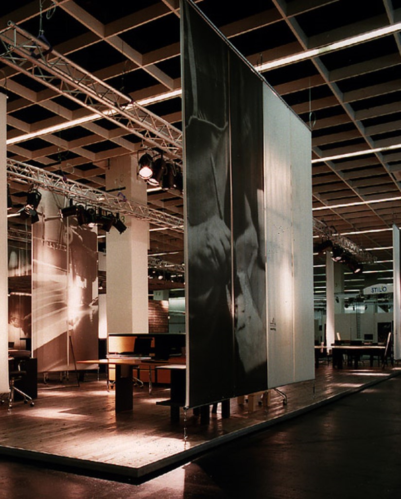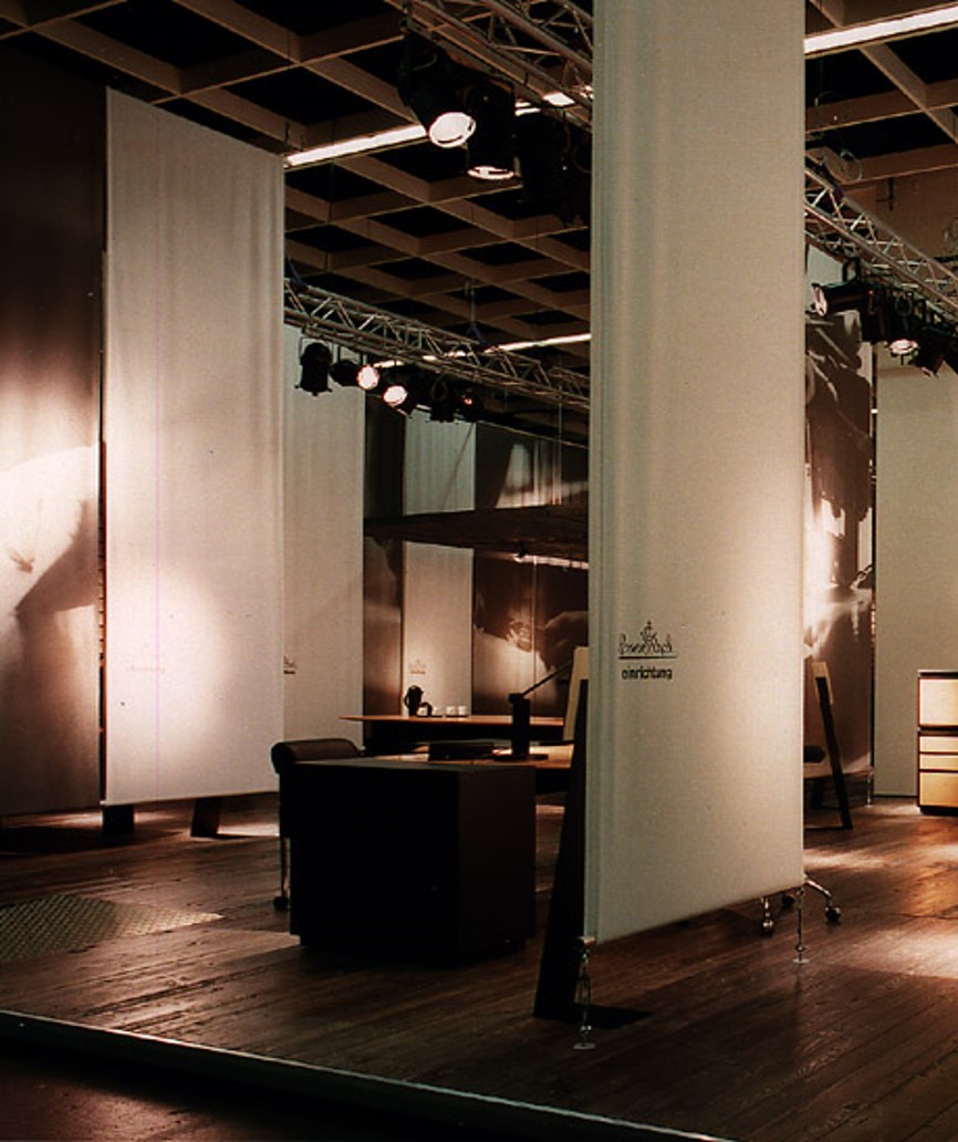 Hängepunkte, Textilbahnen, Rauspund-Dielen: Ein Messestand.