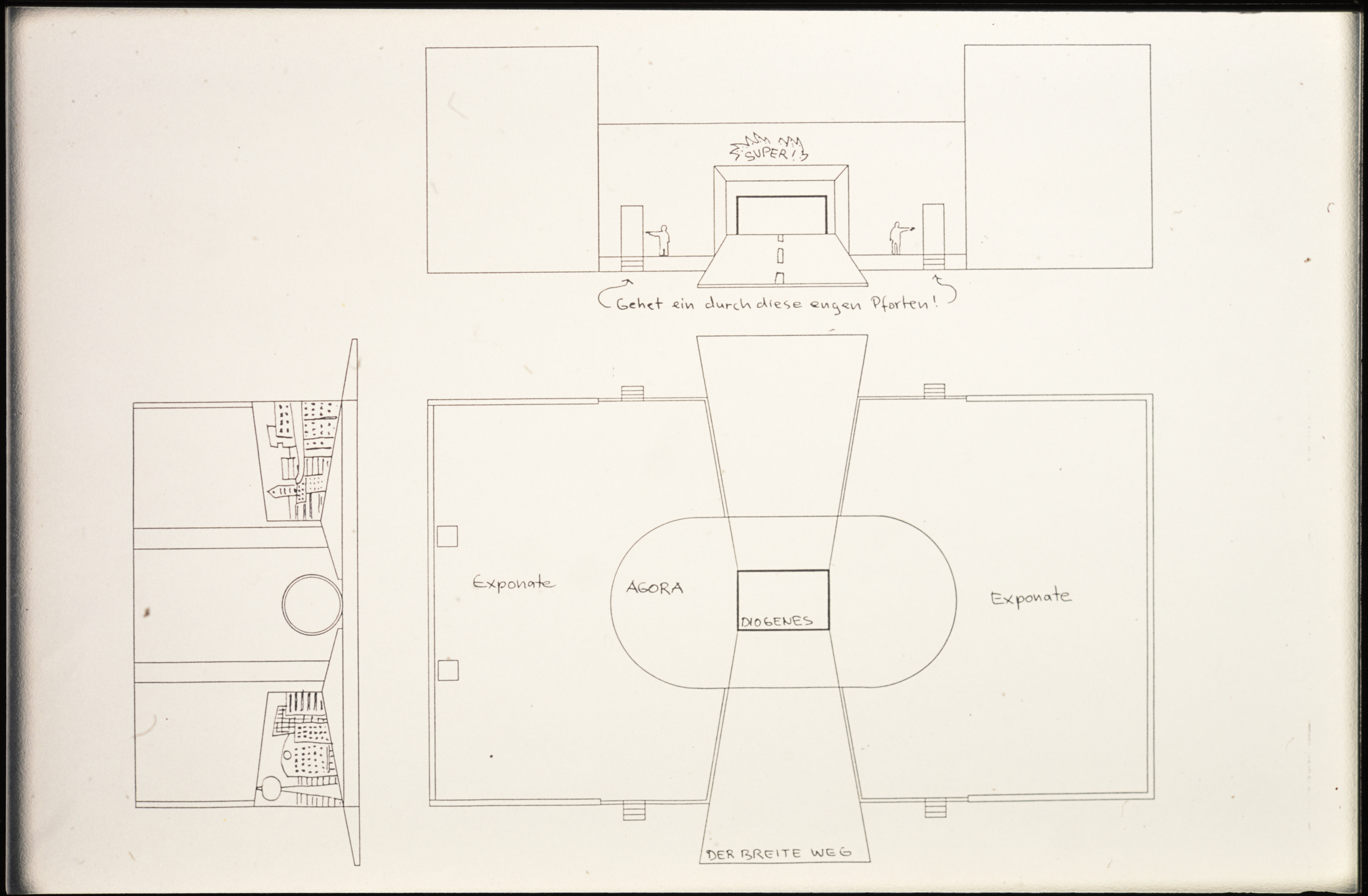 Der gesamte Ausstellungsbereich wird durch eine hohe 'Mauer' begrenzt, welche symbolisch die Grenzen unserer heutigen Welt darstellt. Die Frage des Zugangs stellt uns vor eine Entscheidung: Der BREITE WEG läd uns ein bequem und zügig, umflirtet, von den Reizen und Sehnsüchten einer hemmungslosen Wachstumsgesellschaft, durch die Welt, bzw. die Ausstellung zu eilen.